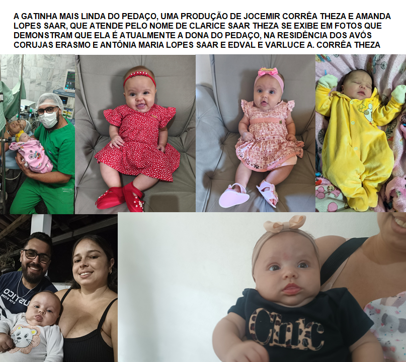 O casal Jocemir Corrêa Theza e sua esposa Amanda Lopes Saar não cabem em si de tanta alegria. É que no final do ano passado, no dia 22/11/2025 veio ao mundo para trazer ainda mais alegria, a Princesa CLARICE SAAR THEZA, às 10:38h, na Maternidade Therezinha de Jesus, em Juiz de Fora, pesando 3,295 Kg e medindo 46,5 cm. Hoje, pouco mais de 5 meses depois a gatona é a alegria da casa. Ela cresce a olhos vistos e vem fazendo também a alegria dos avós paternos Edival Theza e Varluce Aparecida Corrêa Theza e Maternos, Erasmo Saar e Antônia Maria Lopes Saar. Por onde passa a gatinha arranca suspiros e todos ficam querendo pegá-la no colo, beijar e arrancar um sorriso, por menor que seja.